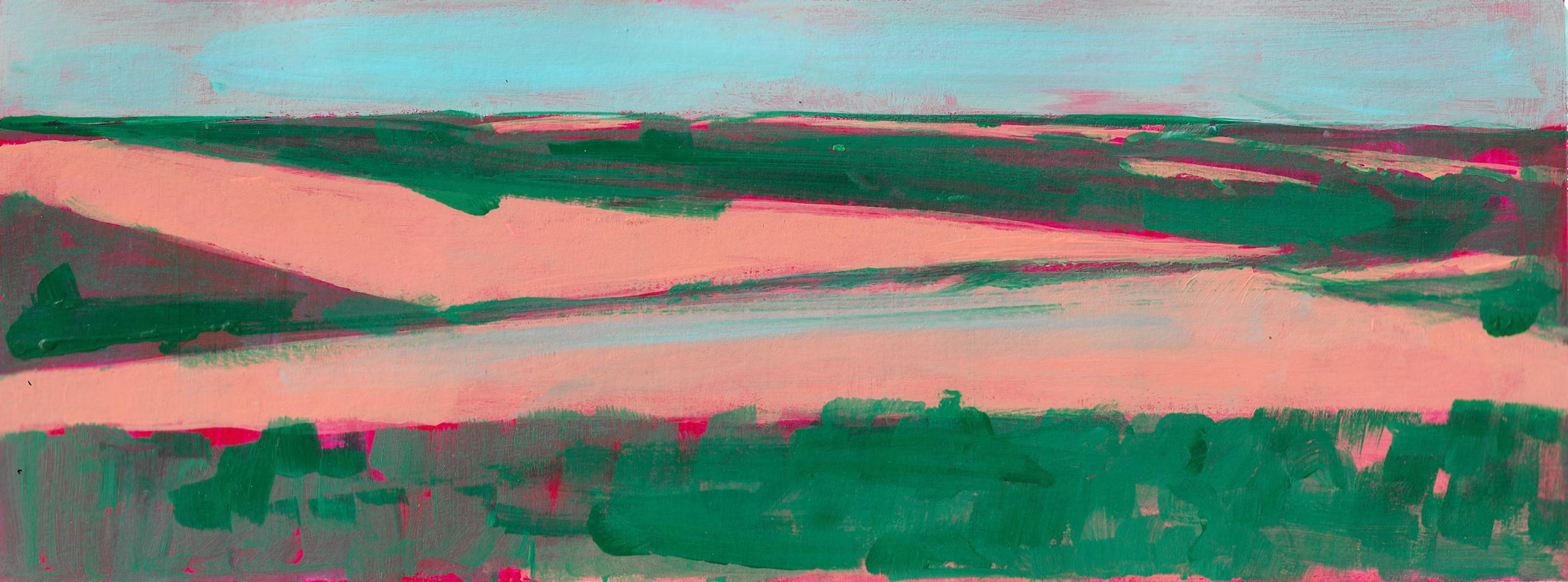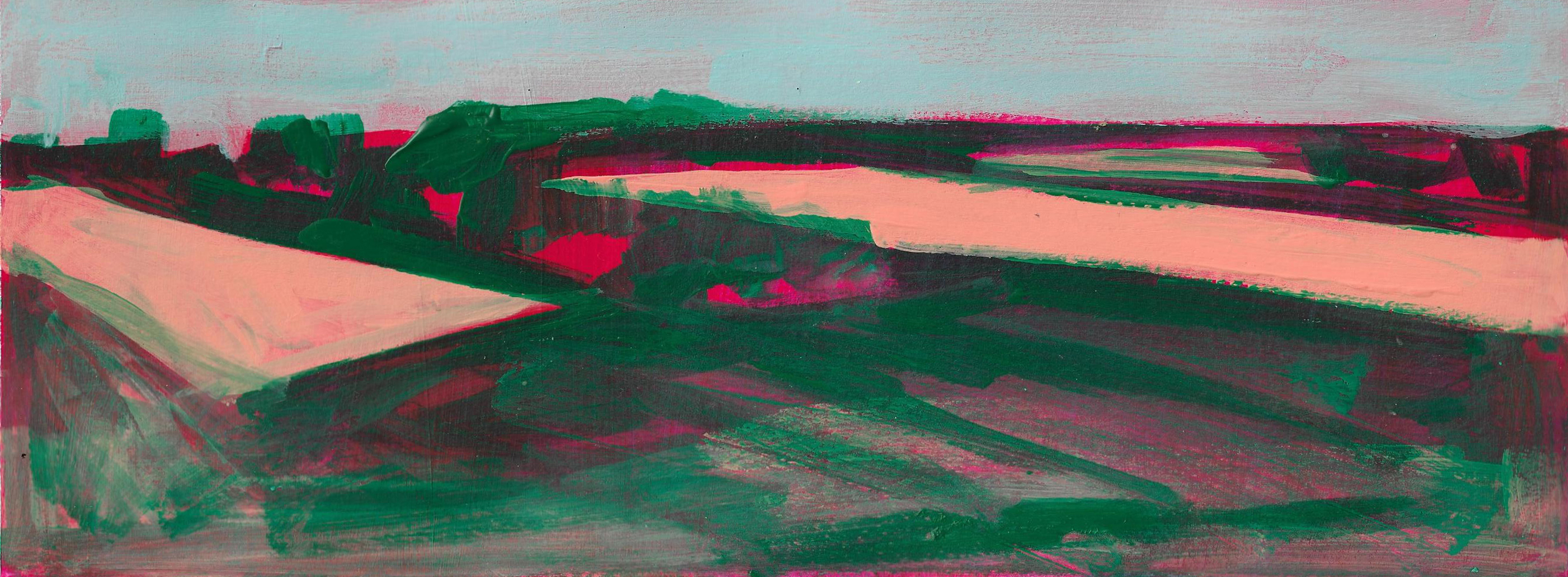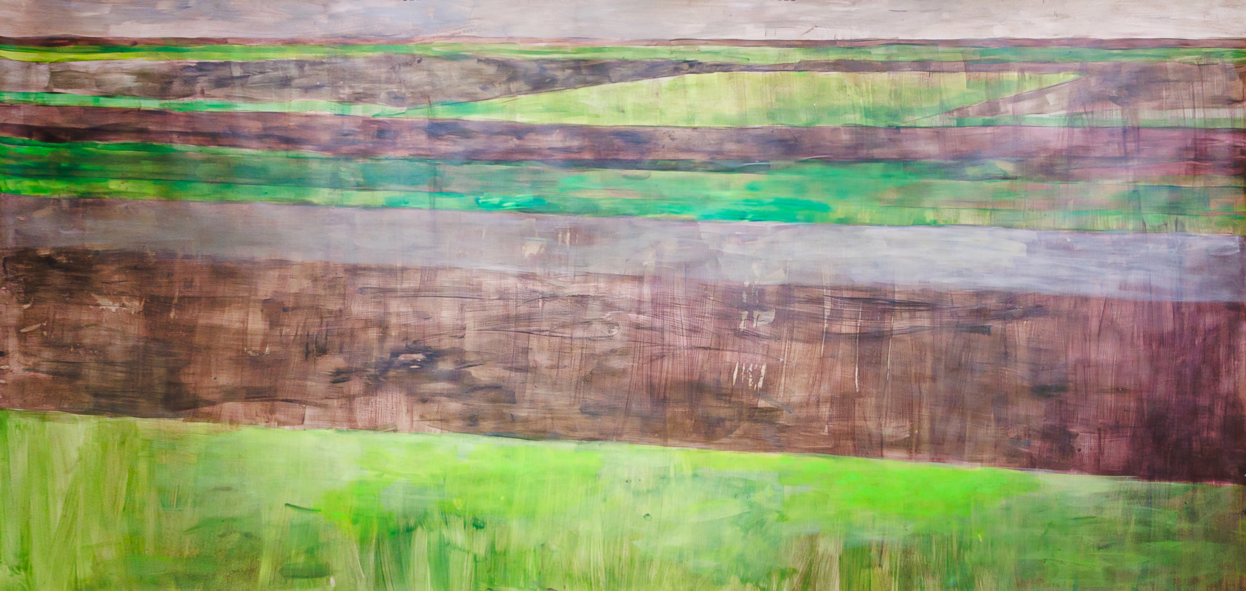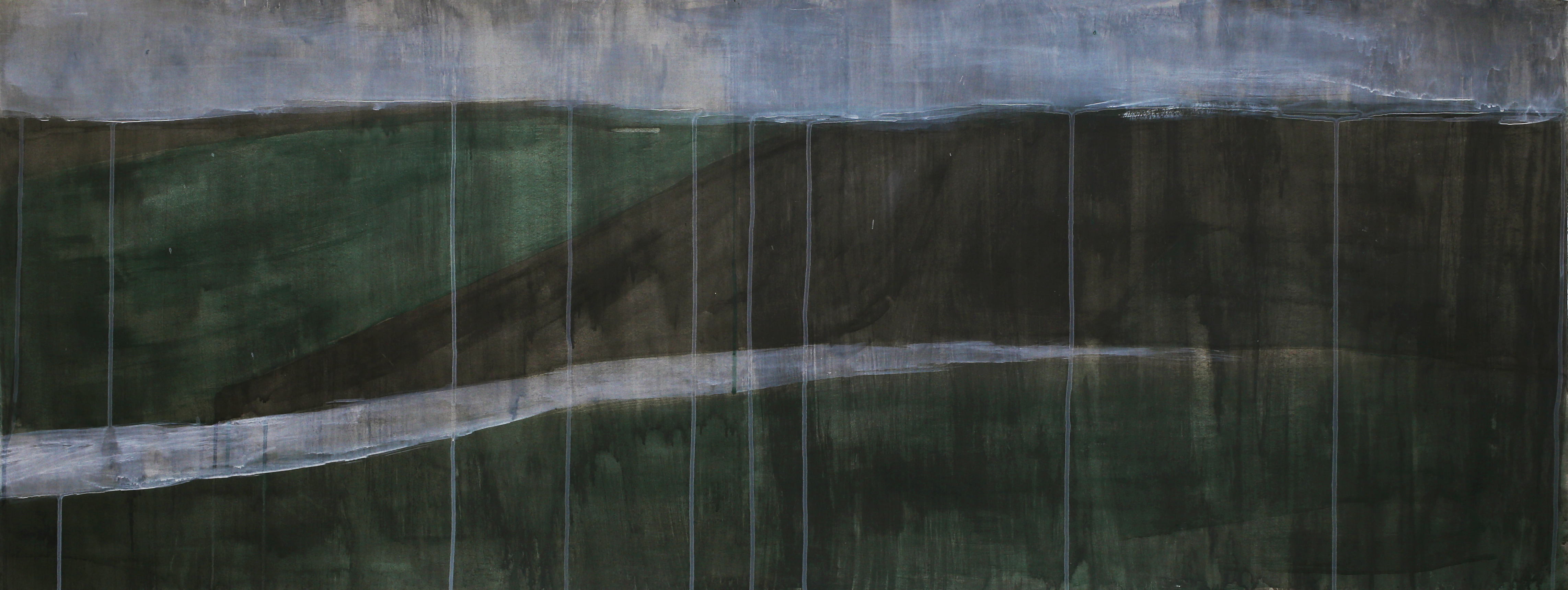 The paintings that make up this exhibition were created as a result of visual and video recordings made along the Belgrade–Novi Sad route. Constant, almost daily travel by train through this plain became a meditative routine that opened a space in which the outer world of the plain and the inner world of the author meet. Silent Territories become a place of encounter—outside and inside, our outside and personal inside—and, during the brief period in which Silent Territories inhabit the gallery space, they create a quiet space of contemplation for the viewer as well.